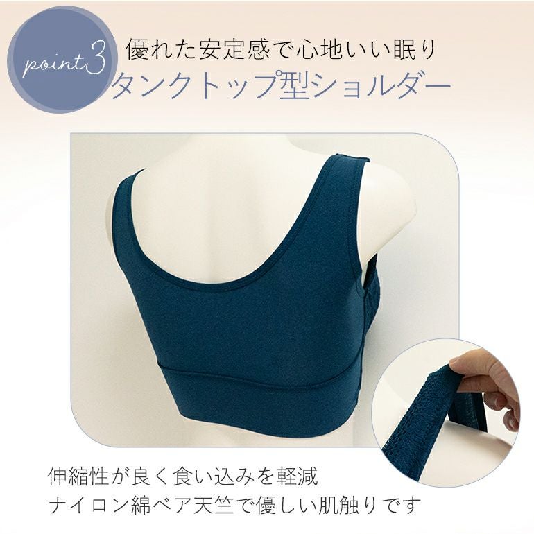幅広アンダーとタンクトップ型ショルダーが安定感を高め、締めつけ感を抑えながら、就寝中もズレにくく快適にサポート。前中心は可動式カシュクールで体形に合わせてフィットし、丸みを潰さず自然に中心へ寄せます。立ち上げ三角パッドが前中心の隙間を埋め、なめらかなシルエットに。さらにカップ下部の厚みウレタンが下から押し上げ、ふっくらとしたデコルテを演出します。