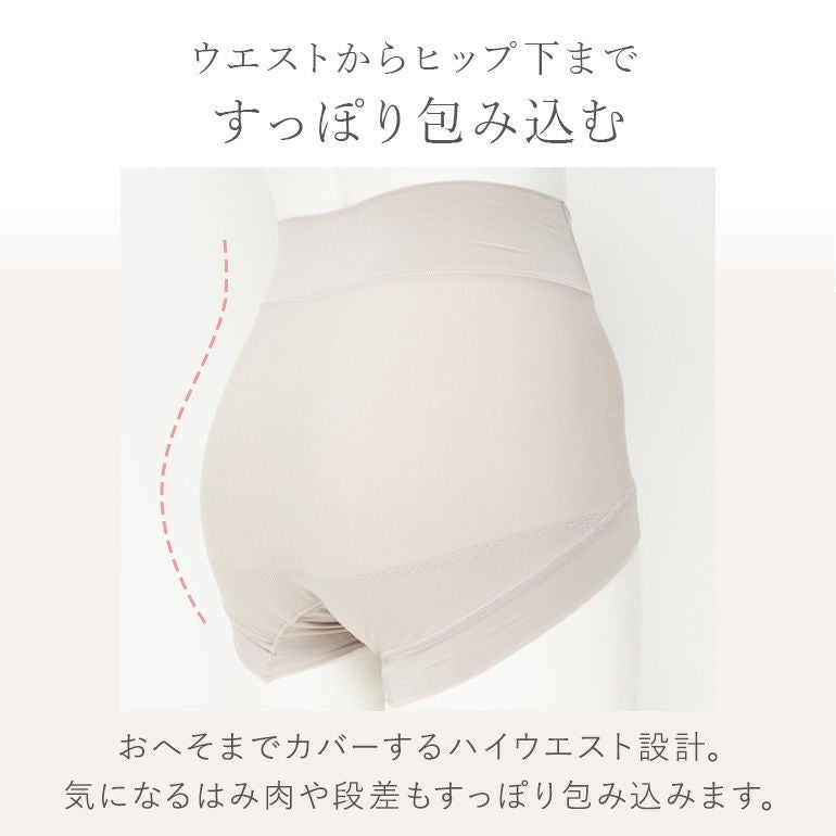 おへそまでしっかりカバーするハイウエスト設計で、腰周りのはみ肉をすっぽりカバー。食い込みにくく段差を作りにくい仕様です。