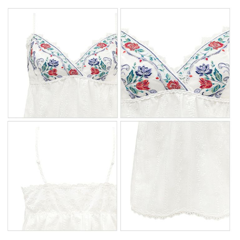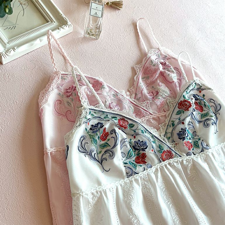 アンティークの食器からインスピレーションを得た、花柄刺繍のレースを使用したキャミソールです。
