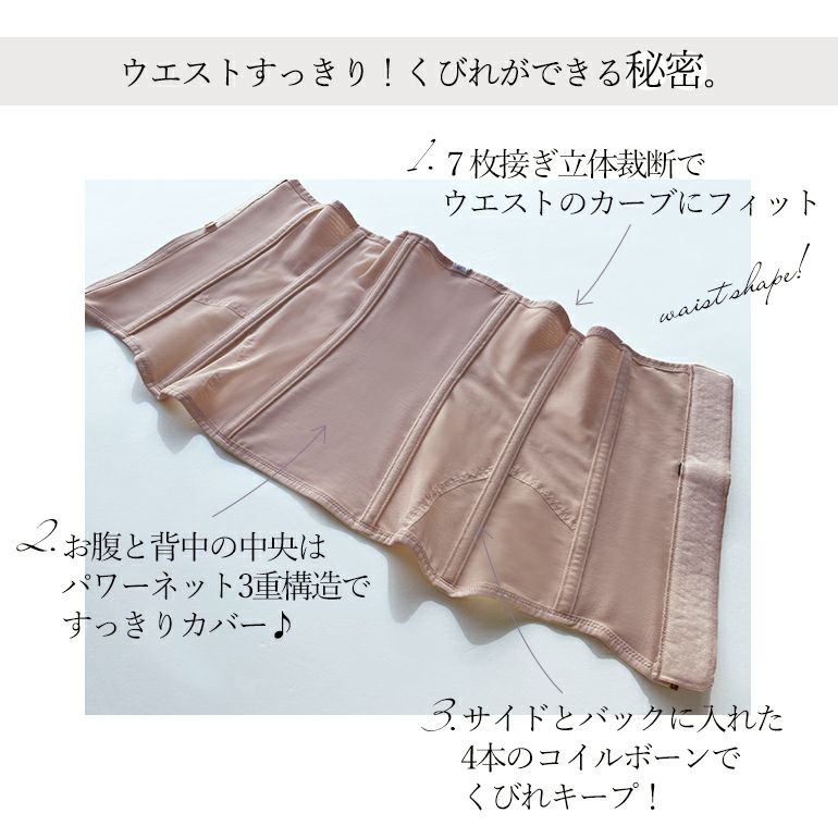 4本のコイルボーン*がウエストを支えてくびれをキープし、アンダーバストから下腹部をしっかりカバー。また、ウエストニッパーがバストを支える土台としても機能するため、バストを理想の位置にキープします。