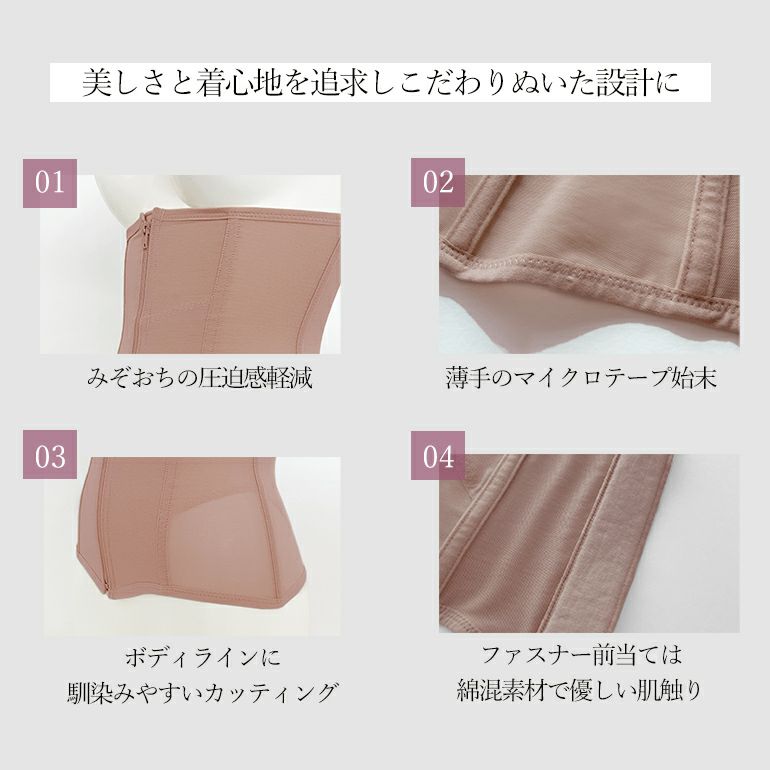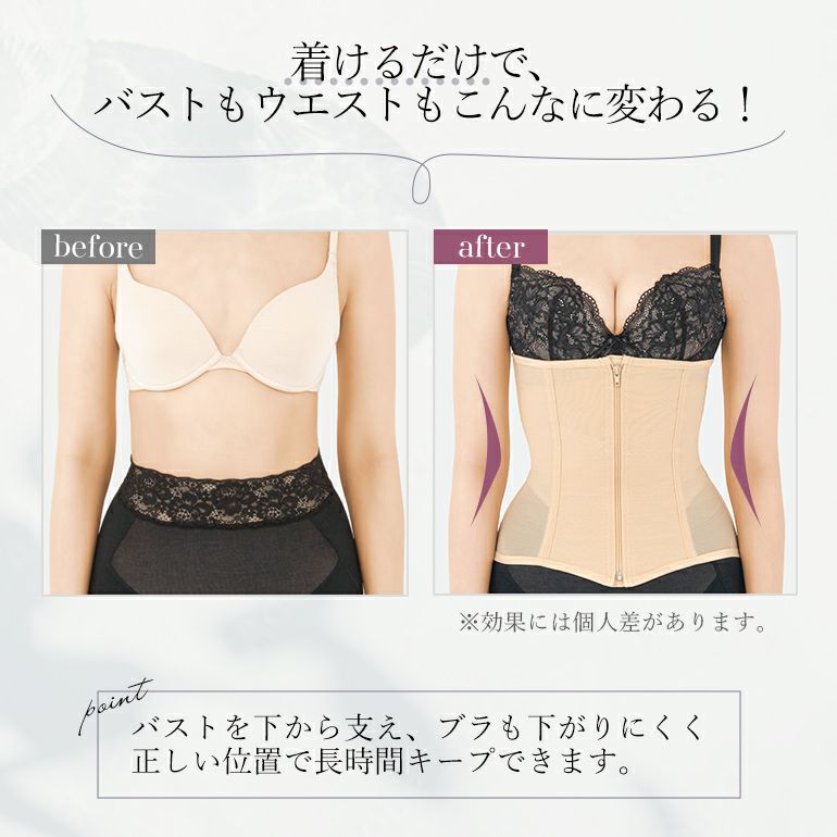 4本のコイルボーン*がウエストを支えてくびれをキープし、アンダーバストから下腹部をしっかりカバー。また、ウエストニッパーがバストを支える土台としても機能するため、バストを理想の位置にキープします。