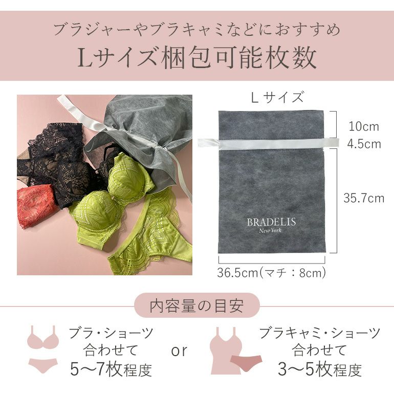 サイズは、小物や洗剤・ショーツにぴったりなMサイズと、ブラやブラキャミにぴったりなLサイズの2種類となっております。