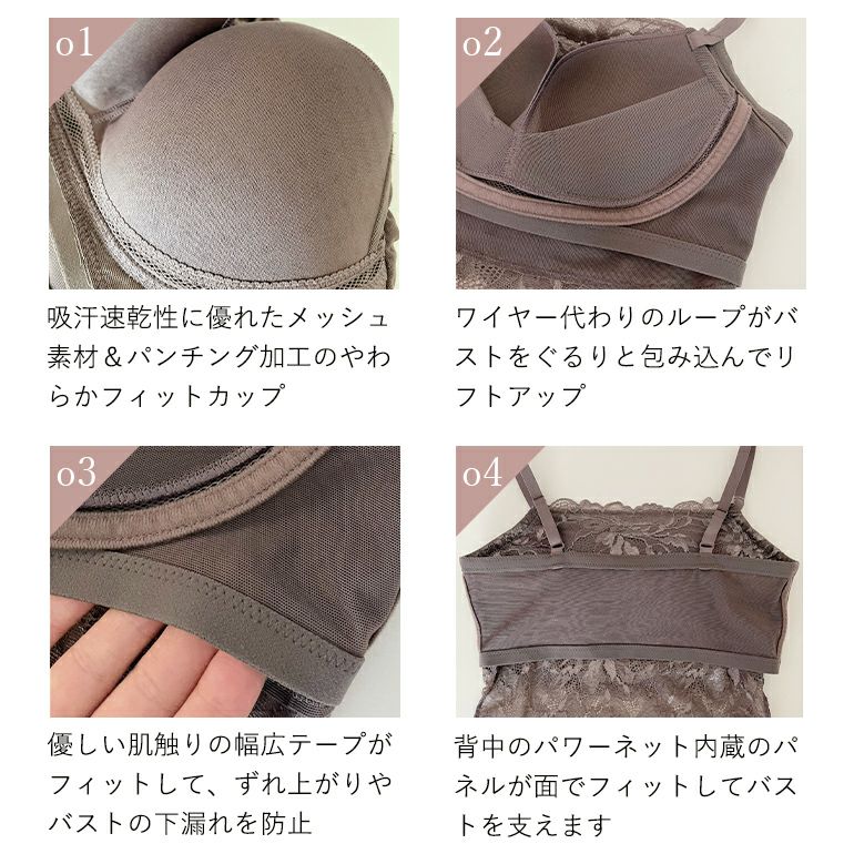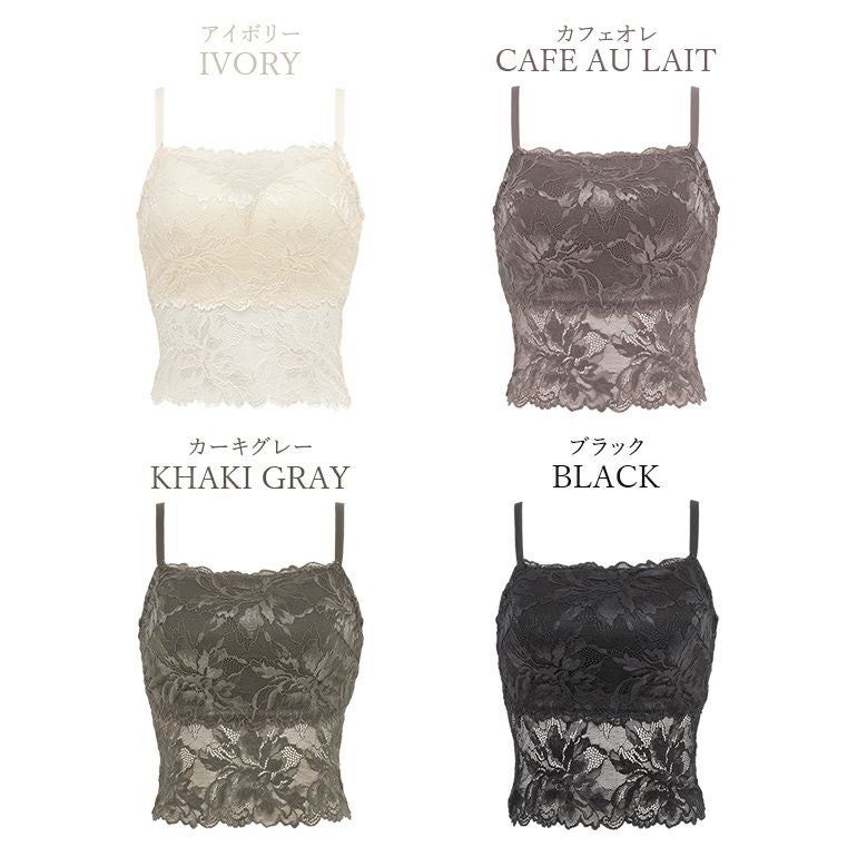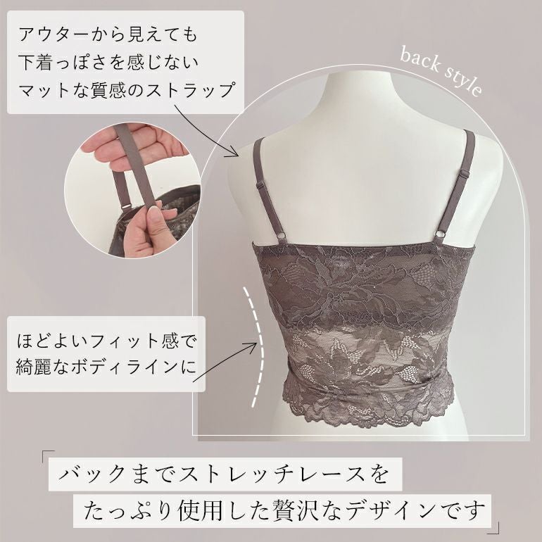 バックまでオリジナル開発のストレッチレースをたっぷり使用した、補整ノンワイヤーブラキャミ。