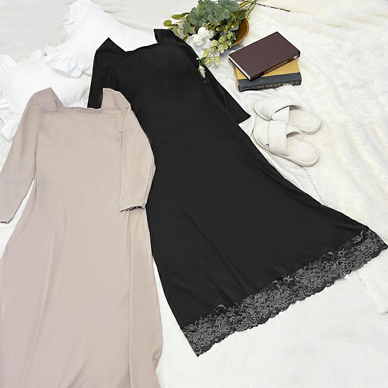 七分袖で腕をスッキリ見せ、ミモレ丈でふくらはぎを上品にカバー。ゆるやかなAラインが、お腹やお尻を自然に包み込みます。季節やシーンを問わずお召しいただけるデザインです。