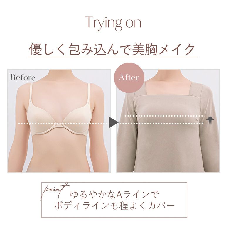 柔らかなフィット感で楽な着心地とバストアップ機能を両立できるルームウェアです。お風呂上がりや急な来客時でも、これ一枚さっと着るだけでOK。旅行先のリラックスウェアにもぴったりです。