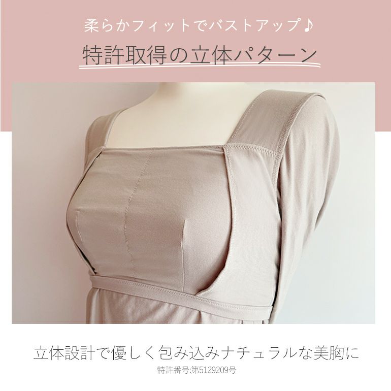 バスト部分は特許取得のハッピーバストアップパターンを採用。(特許番号:第5129209号)バストの丸みを潰さない立体設計により、自然な丸みでナチュラルに胸を美しく見せてくれます。ソフト補整のため長時間着けても締めつけを感じにくいです。