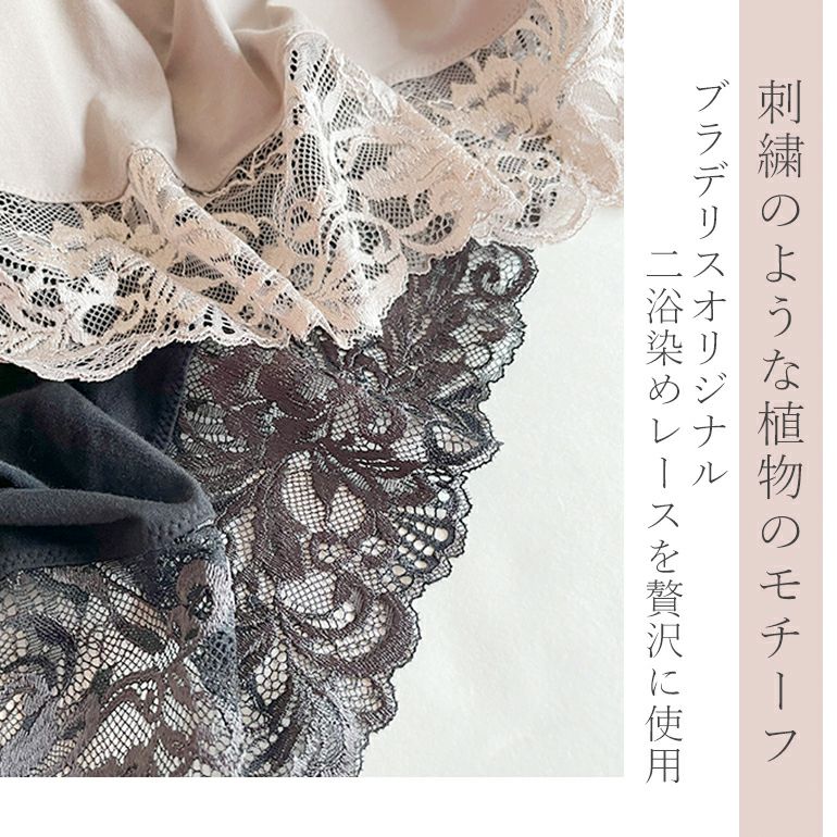 裾にはブラデリスオリジナルレースを採用。刺繍のような存在感あるモチーフがエレガントな印象に。