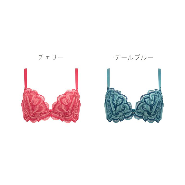 2色の刺繍糸を使用し、ダイナミックな幾何学柄が特徴的なリジットエンブロイダリーレース*を使用した、育乳ステップ2のブラジャーです。ヨーロッパの夏の海をイメージしたティールブルーと、南国の花を連想させるチェリー、印象の全く異なる華やかな2色展開です。