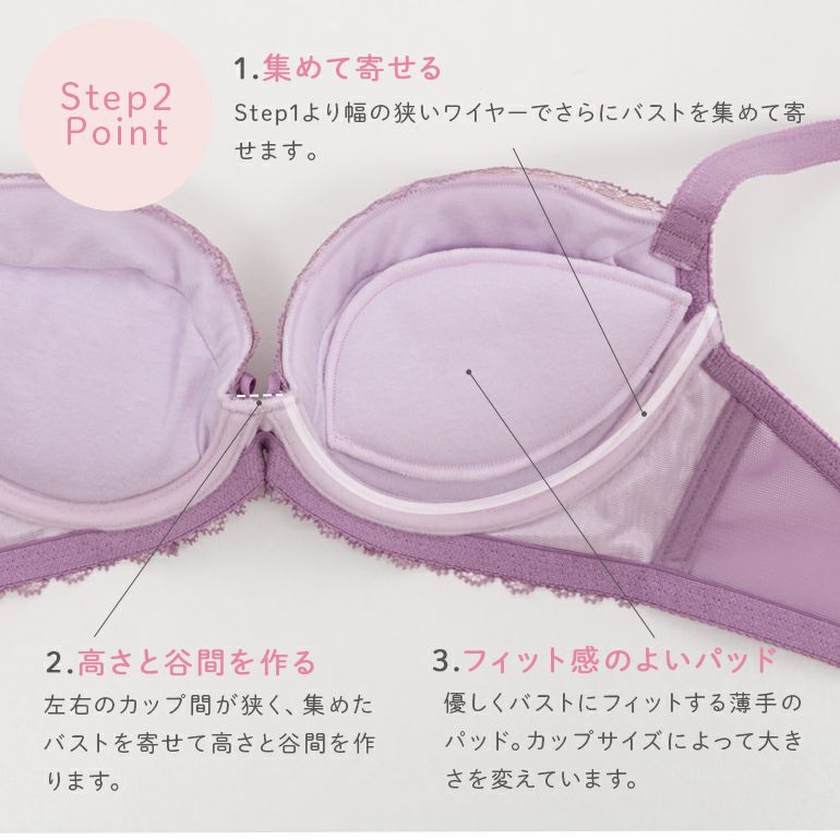 ステップ2の特徴は、幅の狭いワイヤーで、カップに深みを持たせているため、バストの高さをつくります。さらに、乳間が狭く、集めたバストを中心に寄せる機能を持っています。