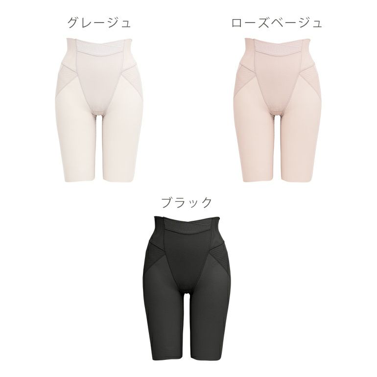 後ろウエストには、姿勢サポートパネルを設置することで、腰回りからソフトにフィットし背中を支え、美しい姿勢をサポートします。また、バック中心にはテープとギャザーを施し、綺麗な丸みのあるヒップラインをキープします。ヒップ下にはパワーネットを裏打ちした補整パネルが、ヒップを下からしっかりと持ち上げて、ヒップと太ももの境目を作ります。