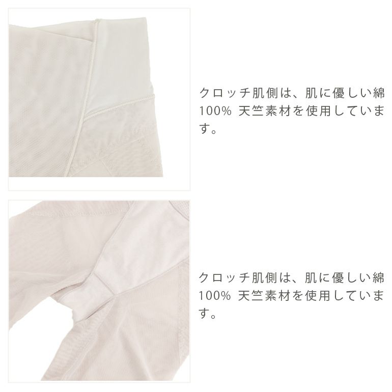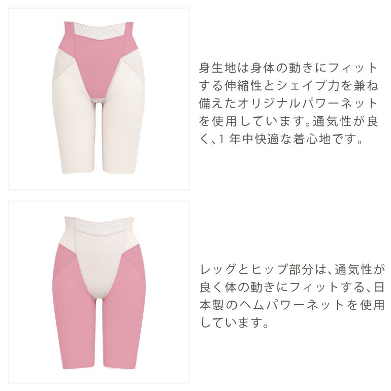 身生地は、伸縮性と通気性に優れたメッシュ素材のパワーネットを使用し、オールシーズン快適なはき心地です。またレッグとヒップ部分には通気性が良く、動きにフィットするヘムパワーネットを使用し、適度な補整力で滑らかなレッグラインに整えます。
