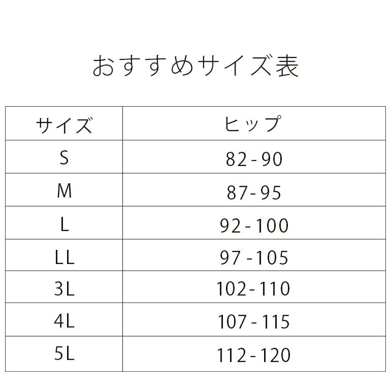- S(82-90)・M(87-95)・L(92-100)・LL(97-105)・3L(102-110)・4L(107-115)・5L(112-120)