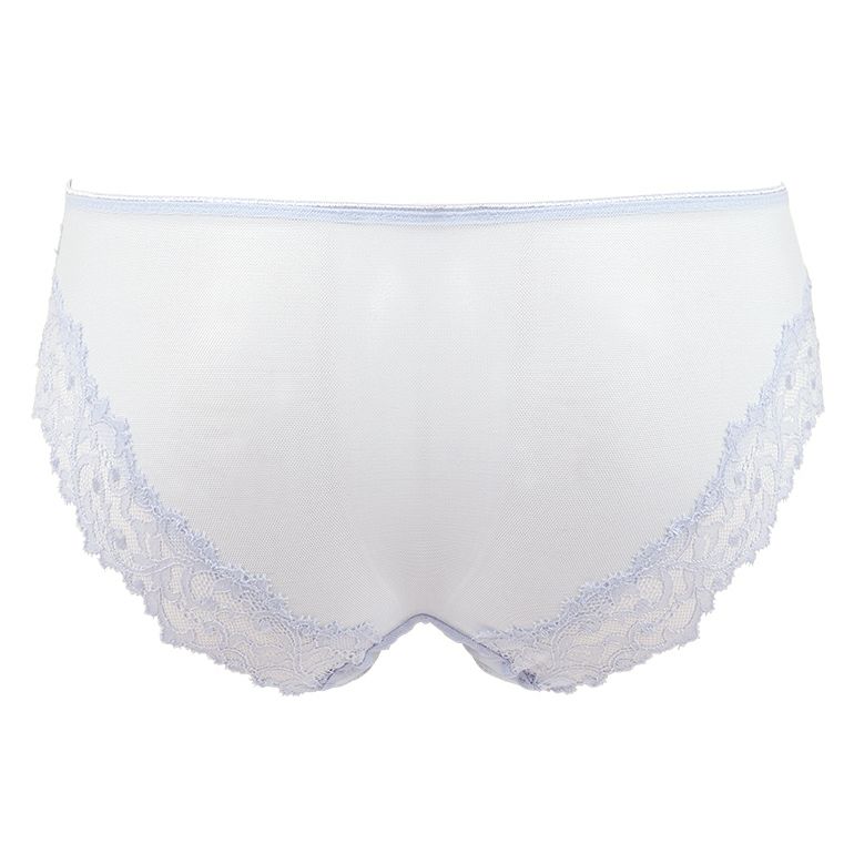 ウエストは伸縮性の良い細幅レースを使用し、優しくフィットします。バックはレースとソフトパワーネットを使用し、肌あたりが優しくアウターに響きにくくなっています。また、クロッチの肌側は、肌当たりが良く、吸湿性の良い綿100%天竺*使用しました。