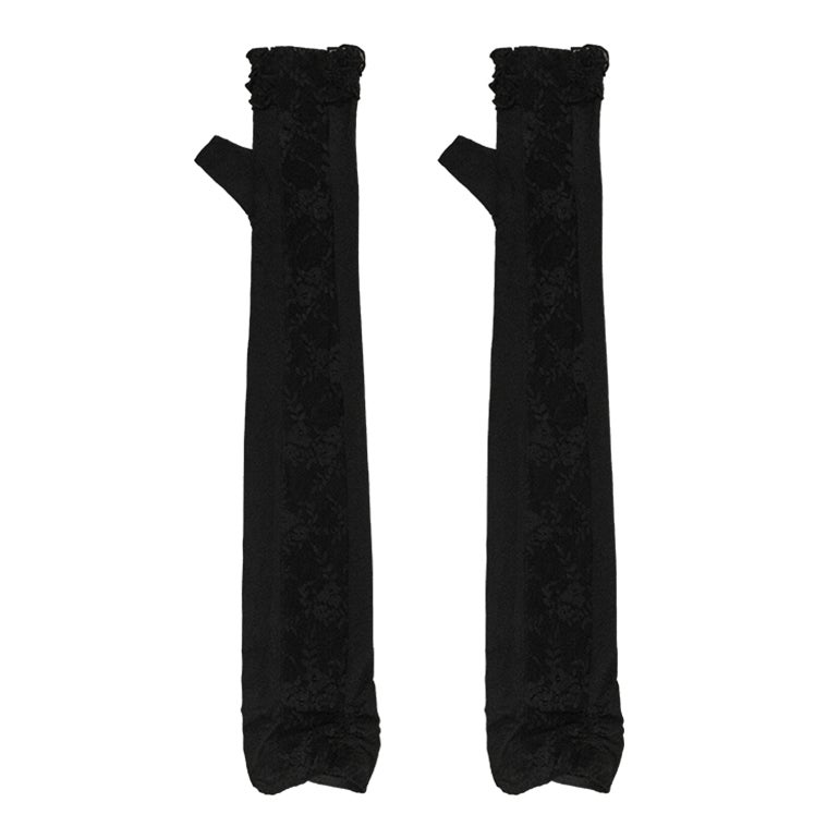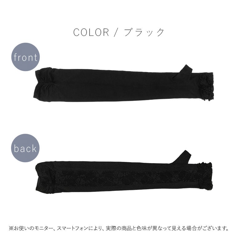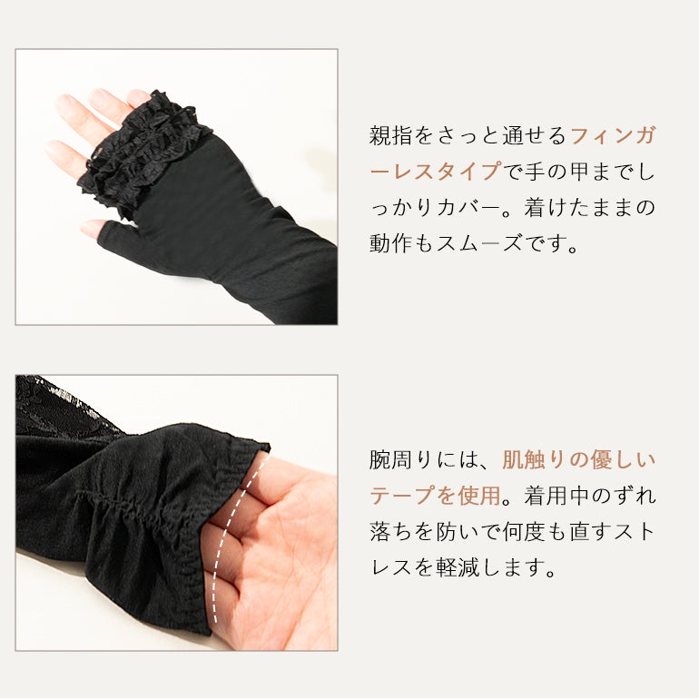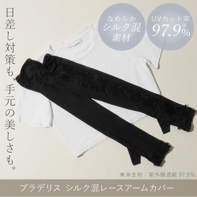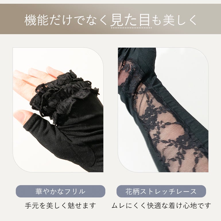 なめらかなシルク混素材と、内側にあしらわれた透け感のある花柄ストレッチレースが特徴で、手の甲のフリルが手元をエレガントに見せながら、高いUVカット率で紫外線をしっかりガードします。