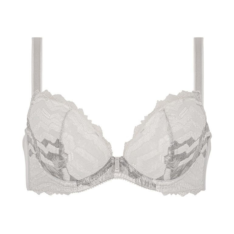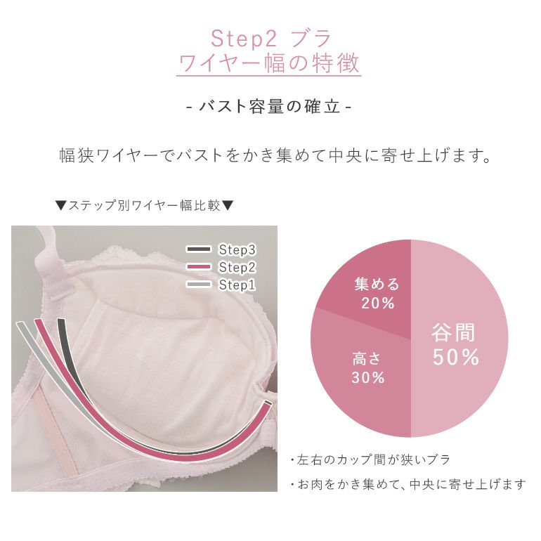 前浅ワイヤーが脇をすっきり整えて丸みのある女性らしいバストを作り、バストトップを高い位置にキープします。乳間が狭くプッシュアップ機能が高いので、しっかりとバストを集めて中心に寄せ上げ、綺麗な谷間を作ります。