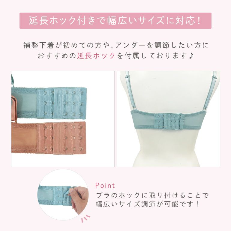 バックは3個どめ3段階ホックで、厚手のパワーネット一枚仕様のため、身体の動きにフィットし安定感のある着け心地です。