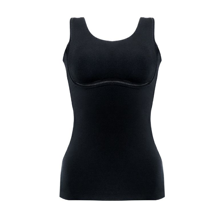 前身部分は、二重構造でお腹を押さえてすっきりシェイプ。伸縮性に優れているため、体の動きにフィットして楽な着心地です。背中は一枚仕立てのため、段差を軽減しなめらかに整えます。幅広ショルダーがバストの重みを面で支え、肩への負担を軽減します。