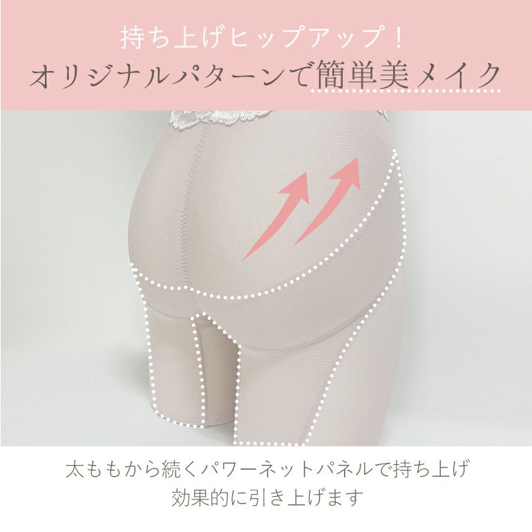 内ももからヒップ下のサイドに沿って施したパワーネットの裏打ち「引き上げパネル」が、太ももからお尻のラインに沿って持ち上げ、ウエスト方向へ引き上げて効果的にヒップアップします。