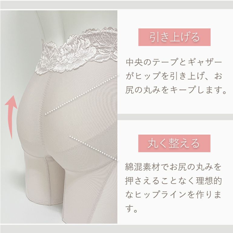 また、ヒップ中心のテープとギャザーで、綺麗なヒップの丸みをキープします。