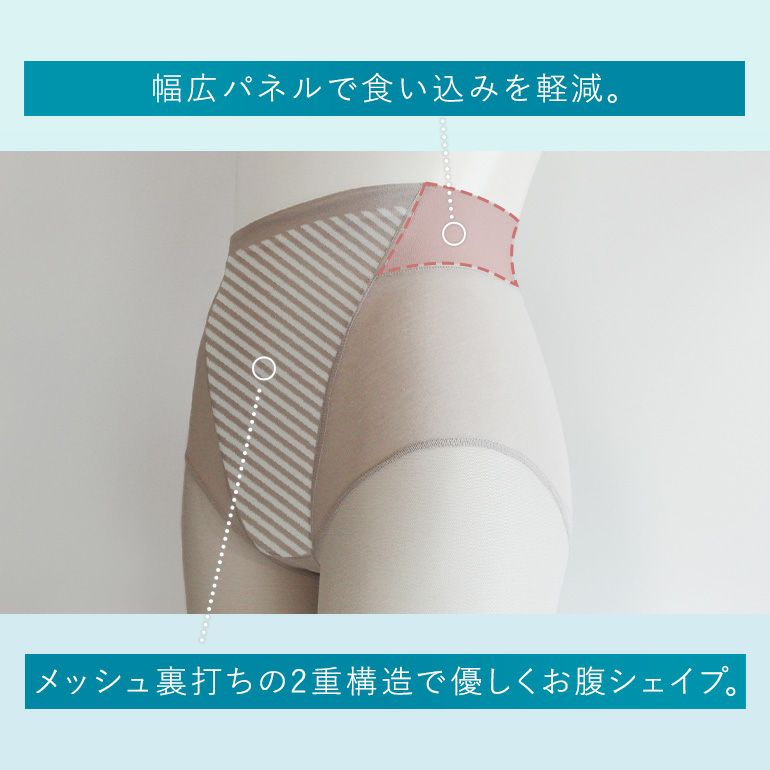 - 身生地に通気性の良いメッシュ素材を裏打ちした二重構造で、気になるお腹をスッキリカバー。