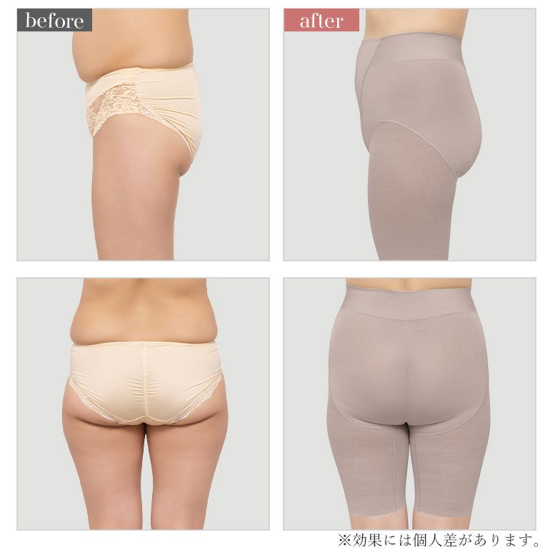 ヒップ部分はナイロン綿ベア天竺*一枚仕立てで、動きに合わせて伸縮しお尻の丸みをキープ。また、ヒップ下からウエストにかけて裏打ちしたパワーネットがヒップを持ち上げ、太ももとの境目を整えます。