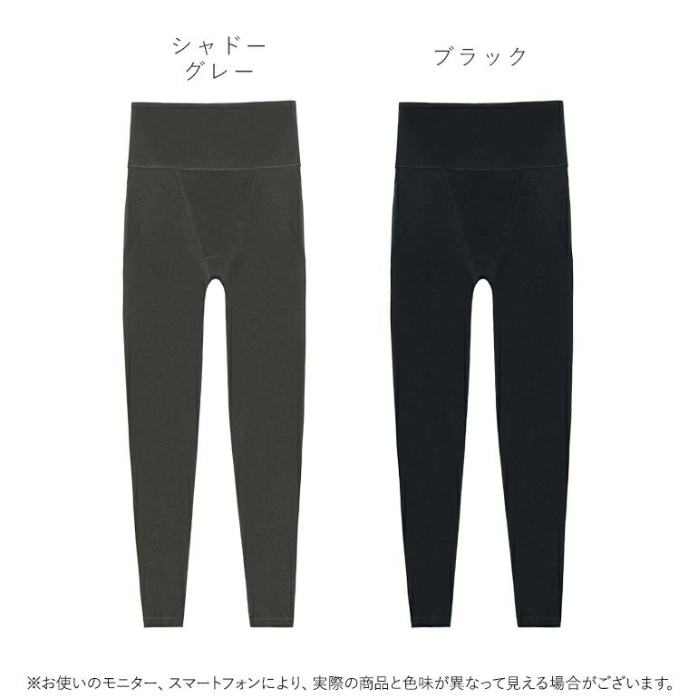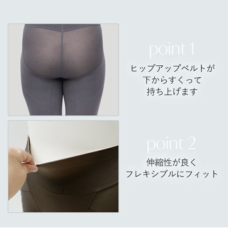 おへそまでの深めのはき込み丈と、太股からお尻までお肉を漏らさずカバーする十分丈のレギンスは、ヒップラインの崩れを防いで美しいレッグラインに導きます。伸縮性のある生地はフィットして安定感があり、なめらかな肌触りで快適なはき心地です。