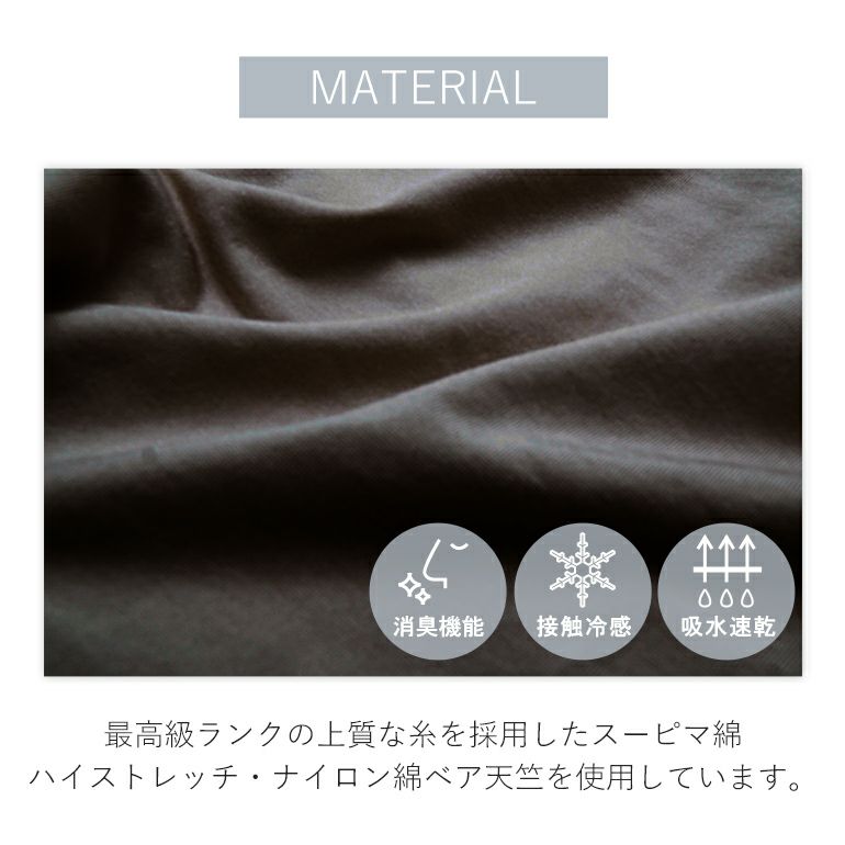 - 薄手で柔らかく優しい肌触りの、ナイロン綿ベア天竺(ナイロン45%・綿40%・ポリウレタン15%)を使用。伸縮性に優れ、ソフトなフィット感で締めつけ感が少ないです。吸汗・速乾性に加え、汗臭、加齢臭の消臭機能を備えオールシーズン快適です。