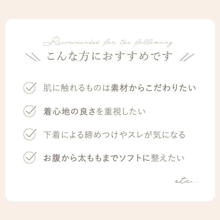 - シルクレーヨン混ベア天竺*を折り返したパネルが腰周りにフィットします。テープを使用していないので食い込みにく優しい着用感です。