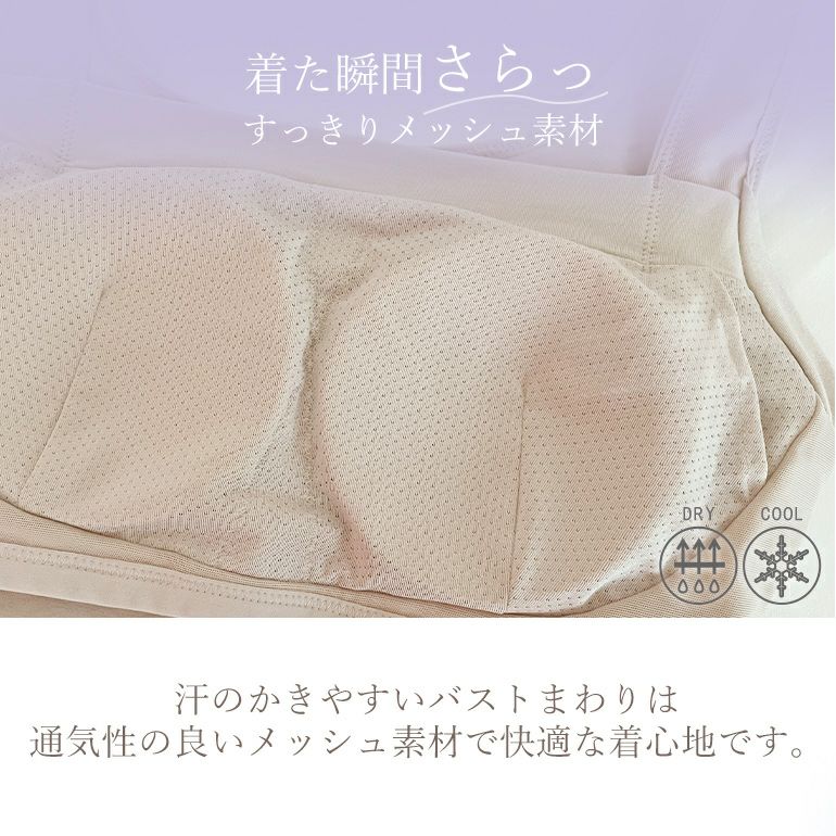 背中上部は広い面積でパワーネットを裏打ちして、面で背中をサポートします。さらに、消臭機能(汗臭)付きの綿ベア天竺素材を使用した「はみ肉ストッパー&汗取りパッド」は、脇のはみ肉を軽く押さえる効果と、汗取りパッドとしての吸汗性に優れ、快適な着心地です。