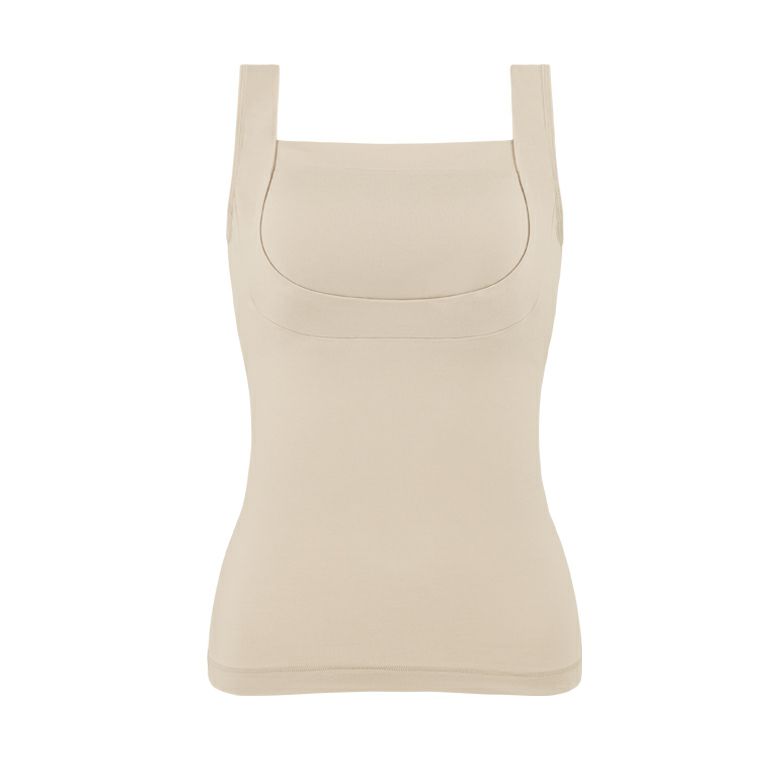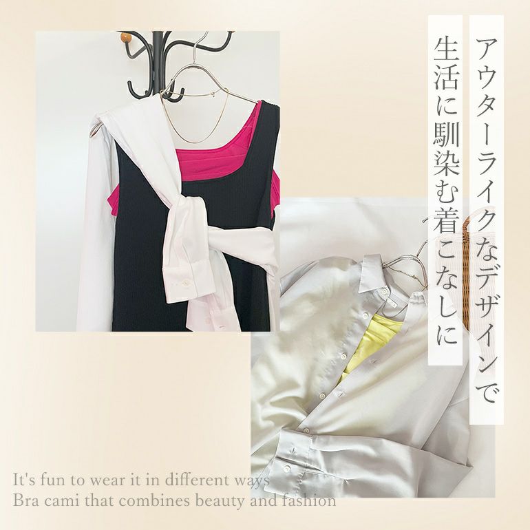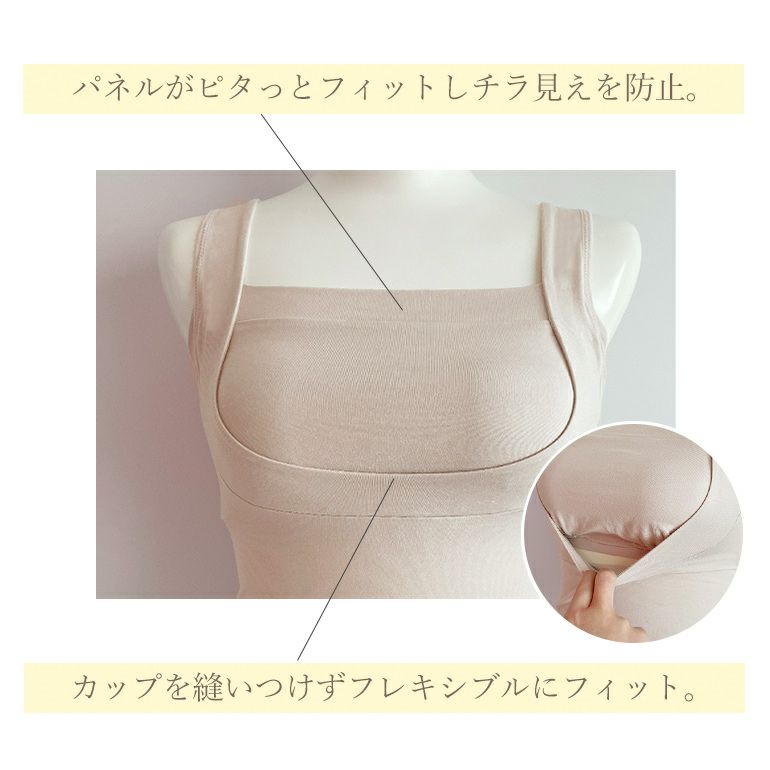 胸元は谷間見えを防ぐスクエア型で、アウターから見せる着こなしも楽しめます。