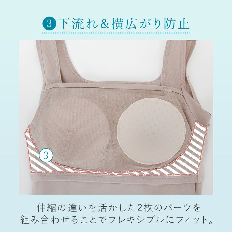 カップのアンダーは本体と縫い付けず可動域を広げ、幅広いバストサイズにフィット。バストの脇もれ・下もれを防ぐ『もれ防止パネル』を採用し、アンダーにしっかりフィットして安定感を保ちます。