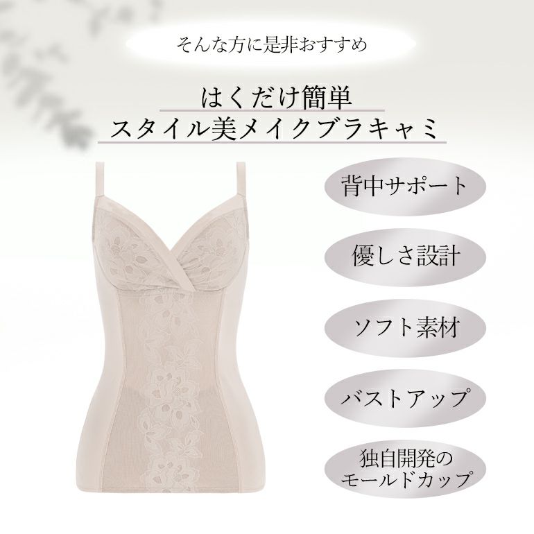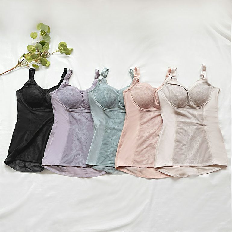 レースメーカーと共同開発した薔薇モチーフのラッセルジャカードレース*(ナイロン85%・ポリウレタン15%)をたっぷりと使用した、下からはいて着るだけで簡単にボディラインを整える補整ブラキャミです。独自のパターンとソフトな伸縮性のパワーネット素材を使用し、楽な着心地でボディメイクをかなえます。異素材の組み合わせとダイナミックなモチーフ使いがインポートライクなデザインです。