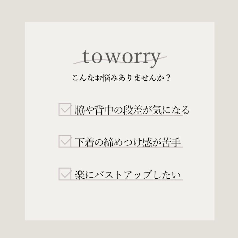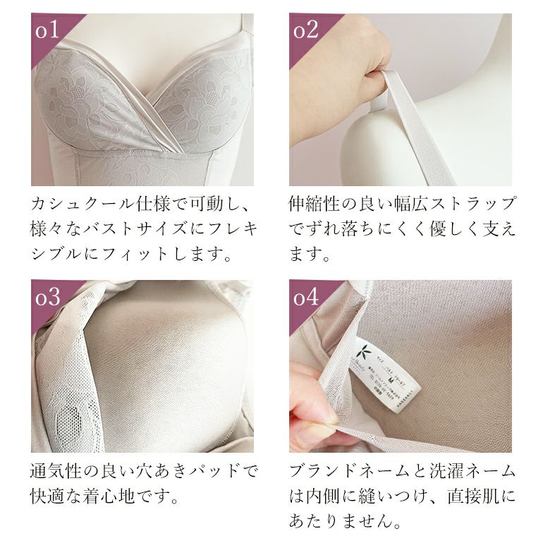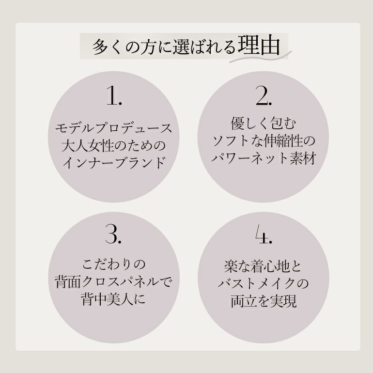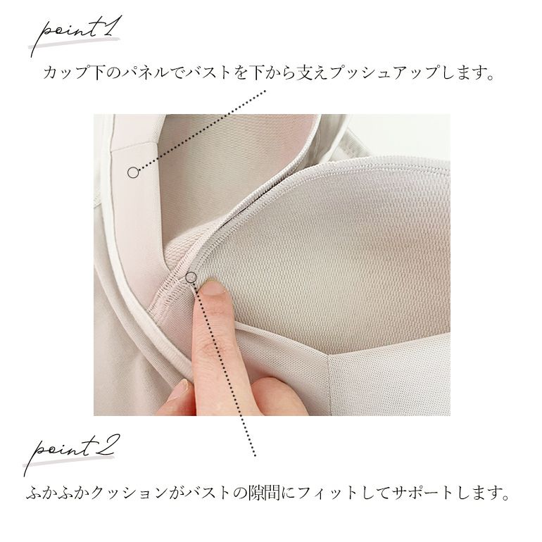 カップ周りに施された独自の補整機能でバストを引き上げてサポートします。さらに、パワーネット素材のパネルがバストの横広がりと下垂を防止し、バスト中心の三角のクッションが丸胸シルエットに整えます。