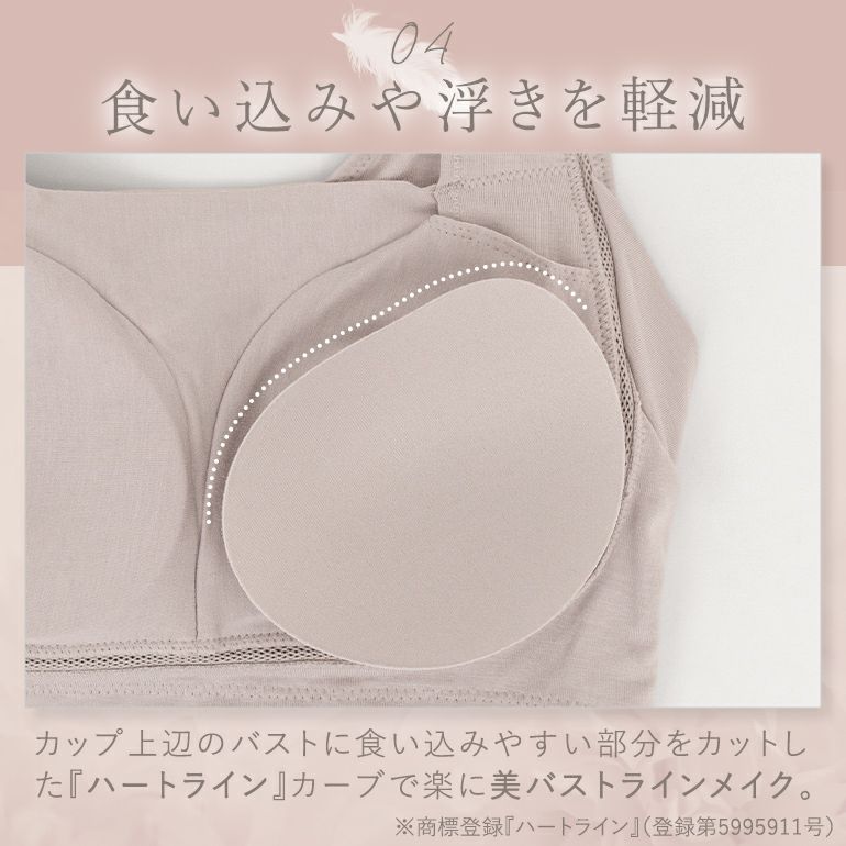 ワイヤー代わりに使用したメッシュテープがバスト周りにフィットして、効果的にリフトアップ。特許取得(※特許第5185887号)のオリジナルパターンでノンワイヤーでも美しくバストメイクします。