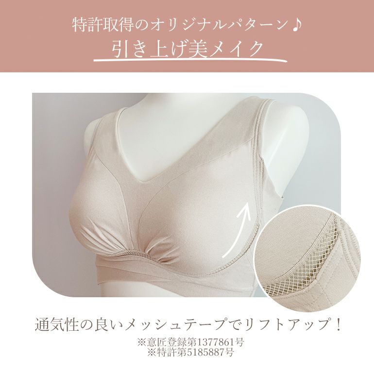 ワイヤー代わりに使用したバストアップメッシュテープが、バスト周りにフィットしてバストを効果的にリフトアップ。特許取得のオリジナルパターンでノンワイヤーでも美しくバストメイクします。