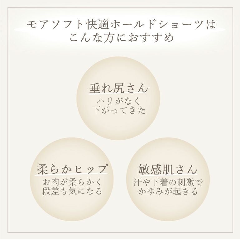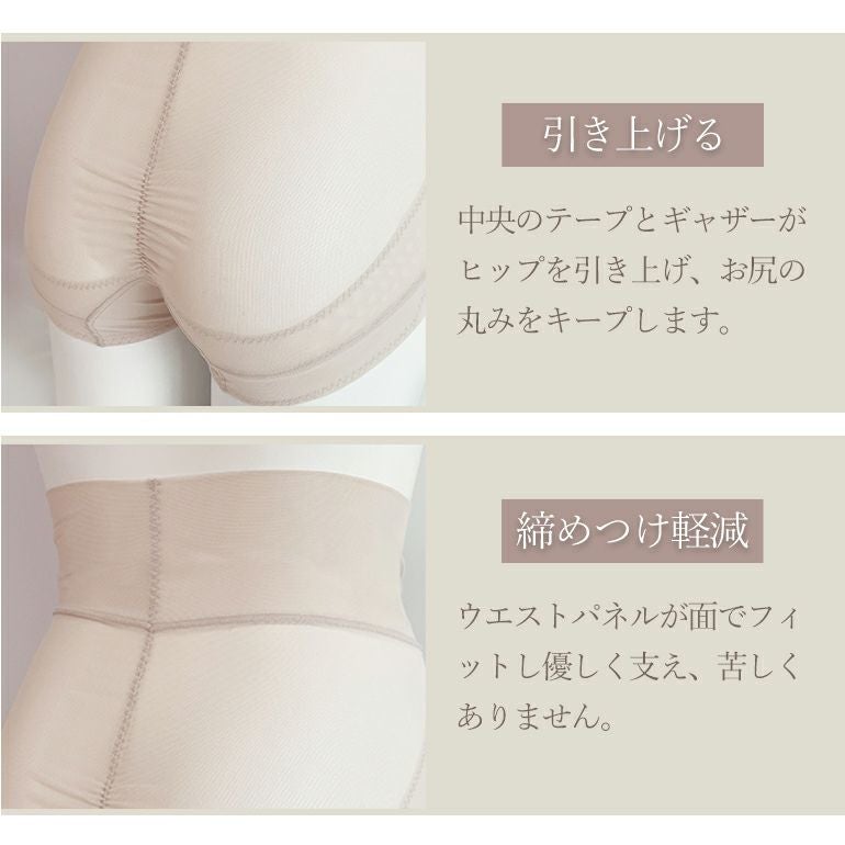 ソフトな着心地で締めつけ感が少なく、お腹からヒップ全体をすっぽり包み込み優しくシェイプします。