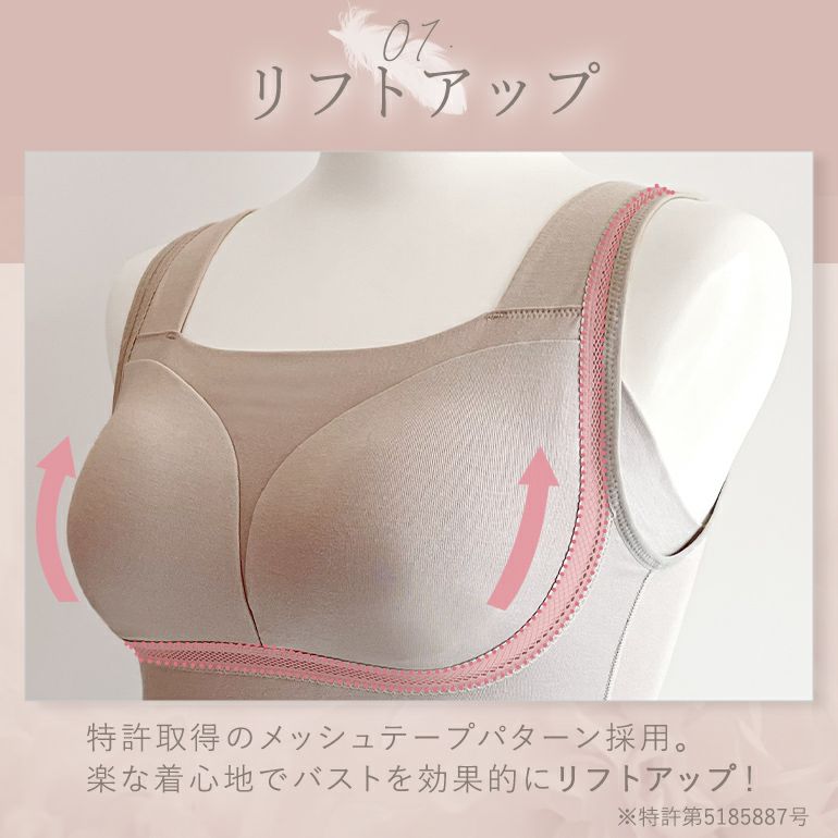 ワイヤー代わりに使用したメッシュテープがバスト周りにフィットして、効果的にリフトアップ。特許取得(※特許第5185887号)のオリジナルパターンでノンワイヤーでも美しくバストメイクします。