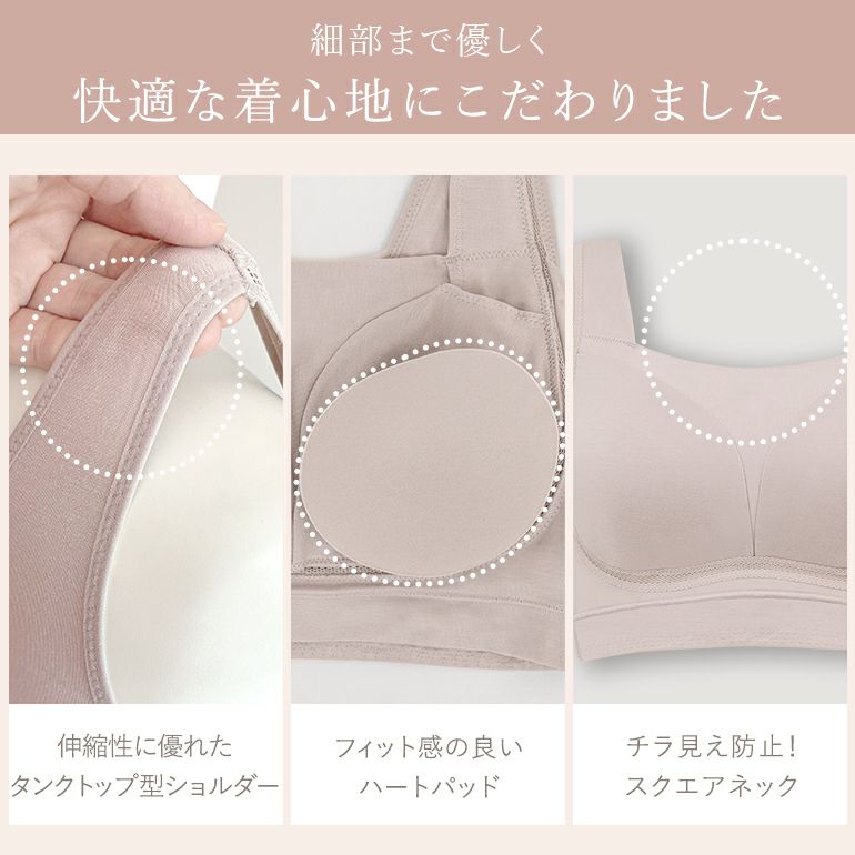 柔らかな着心地と、肌への負担や締めつけを感じにくい縫製仕様とパターンで体を優しく包み込むため、就寝時の着用にもおすすめです。