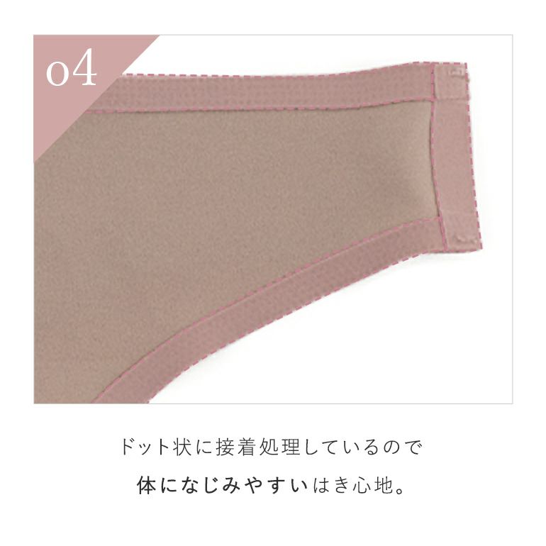 生地端を全てドット接着処理*をしているため、生地の伸縮性を損なうことなく体にフィットし、なじみやすい快適なはき心地です。