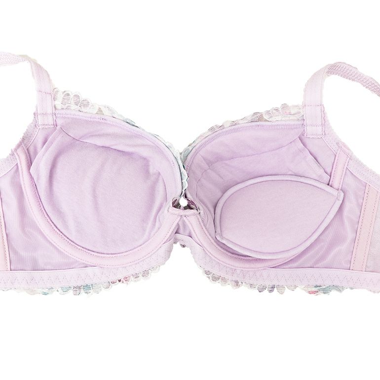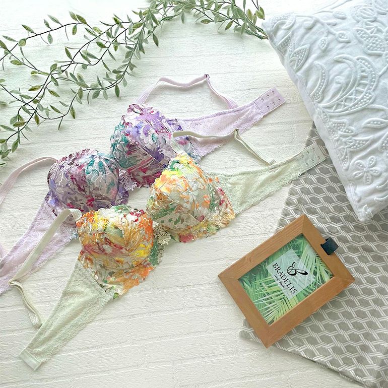 フラワーモチーフのリジットエンブロイダリーレース*を使用した育乳ステップ3のブラジャーです。エンブロイダリーレースはスイスのInter Spitzen社製で、トロピカル調のプリントが映えるデザインです。