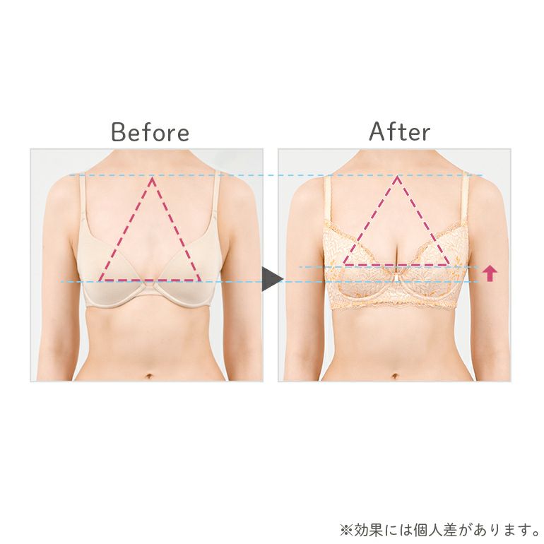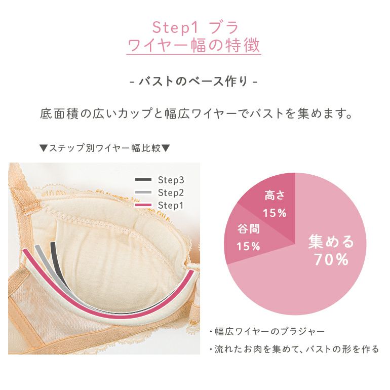 ステップ1の特徴である底面積の広いワイヤーが、集めたお肉を逃しにくく、さらに厚手の不織布*を使用したふわふわカップは集めたお肉をバストとしてよく馴染ませます。非常にフィット感が良く、小さいバストの方には谷間を作り、大きなバストの方はコンパクトラインに仕上げます。