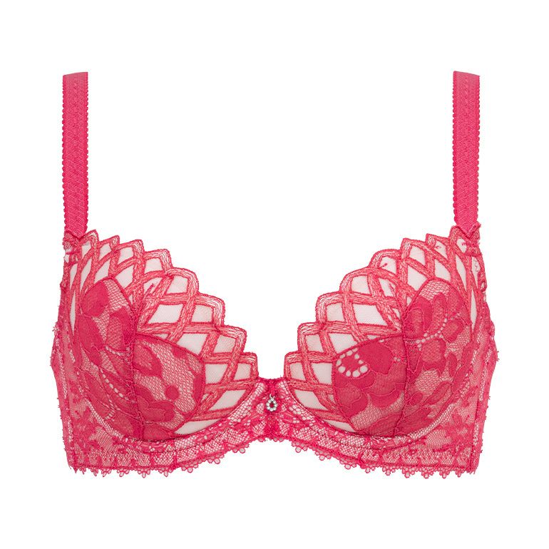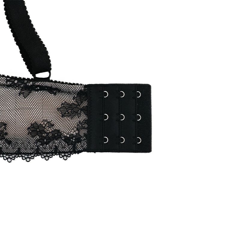 - レース縦ダーツ仕様。レース表下にトリコット*を重ねています。エンブロイダリーレース*を使用しているためカップが立ちあがりやすく、しっかりとバストを寄せ上げ、綺麗な谷間を作ります。