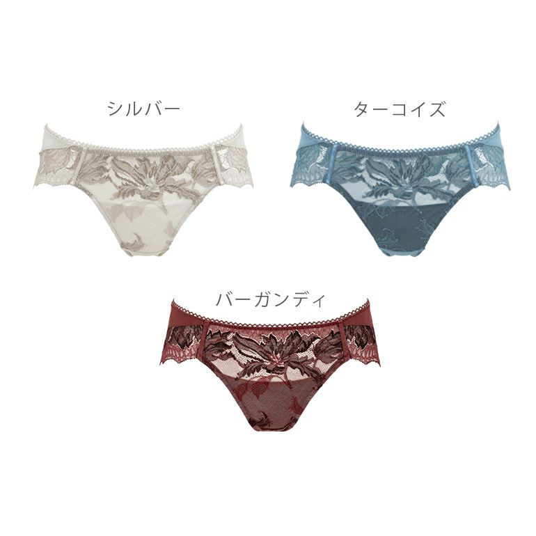 クレマチスの花柄とアールデコ調のドット柄スカラを組み合わせ、二浴染め*ストレッチリバーレース*を使用したパンティです。光沢テープやデザイン性のあるピコテープがアクセントになっています。