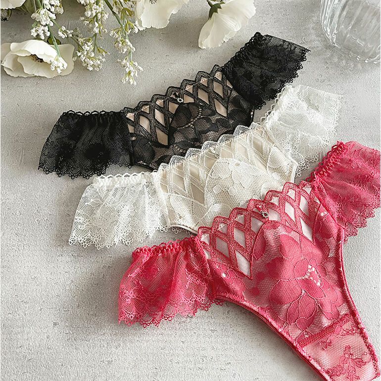 バックはフィット感の良いストレッチレースを使用。食いこみにくくヒップを美しく見せる総レース仕様です。