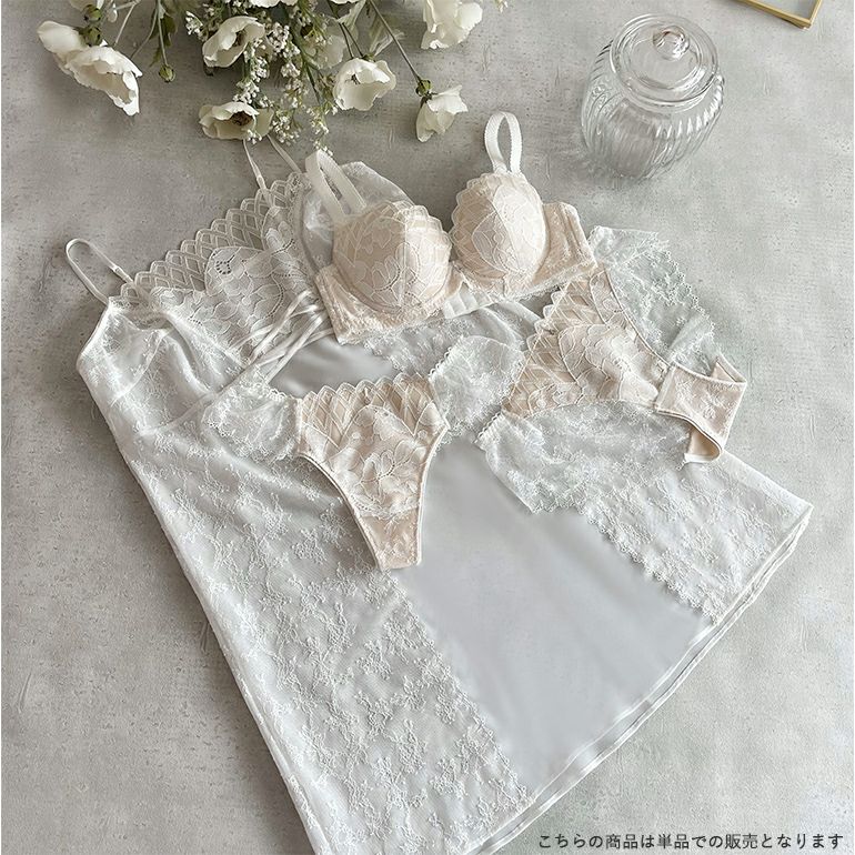 花や葉の柄を大胆に組み合わせた華やかな総レースに、サイドからバックのラッセルレース*にたっぷりと入れたギャザーが印象的なデザインです。