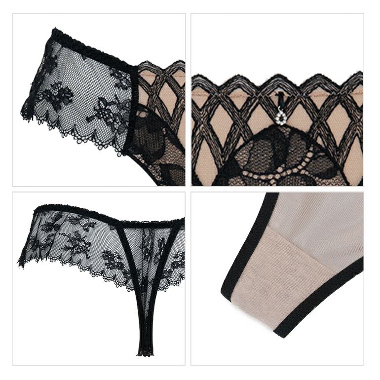 - 裏打ちは透け防止のため、ブラと同色のトリコット*を使用。滑らかで肌触りが良く、はき心地が良いです。