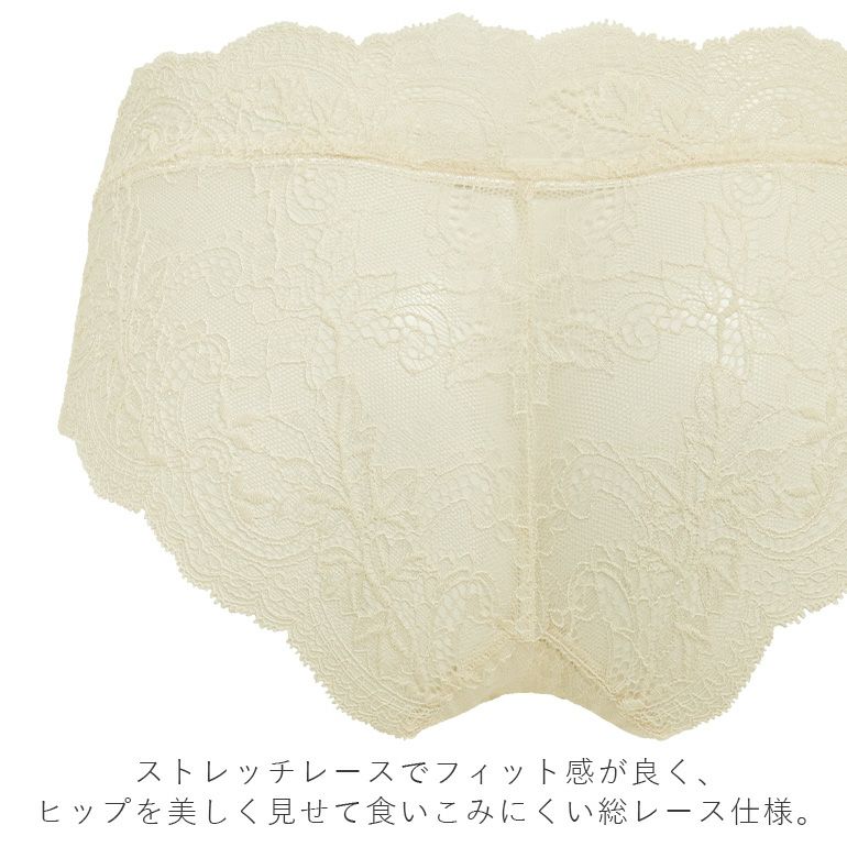 バックはフィット感の良いストレッチレースを使用した総レース仕様です。食い込みにくく、ヒップを美しく見せます。