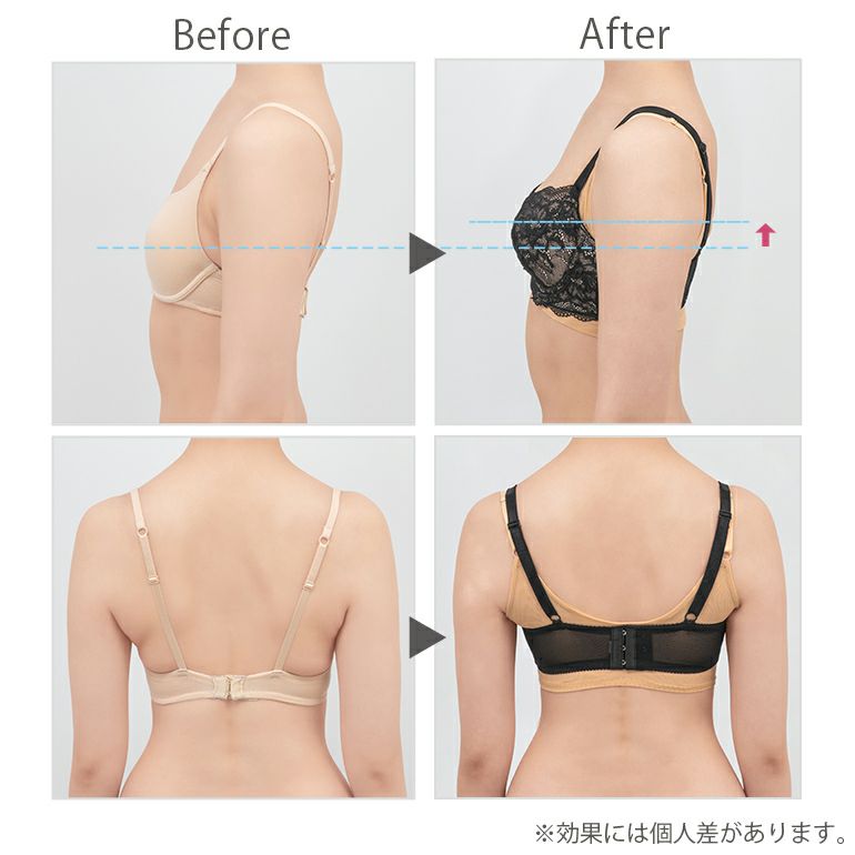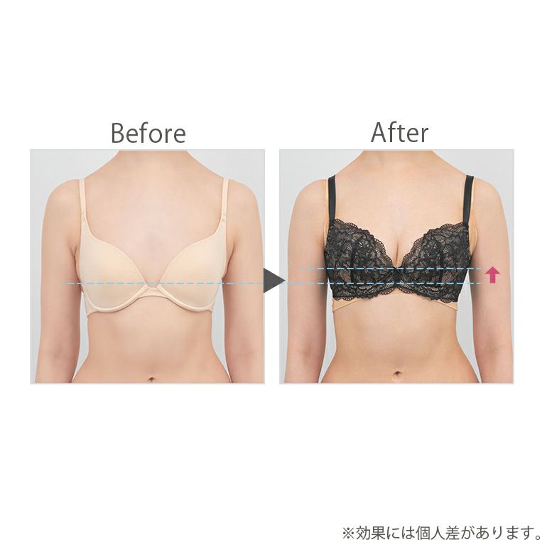 バスト下とサイドに施したパネルが、バストを持ち上げ中心に寄せます。ブラの下に着用することで、脇や背中のお肉をしっかり集め、バストを理想の位置に長時間キープします。また、ブラの上に着用することで、バストの寄せ集め効果がアップし、美しい谷間をキープします。グラマー胸はサイドをすっきりコンパクトに整えます。