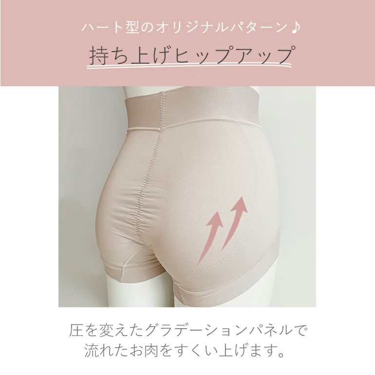 ヒップ下部は、身生地と「ハート尻パネル」と下垂防止パネルの三重構造で、流れたお尻のお肉を集めて上向きの美尻を作ります。