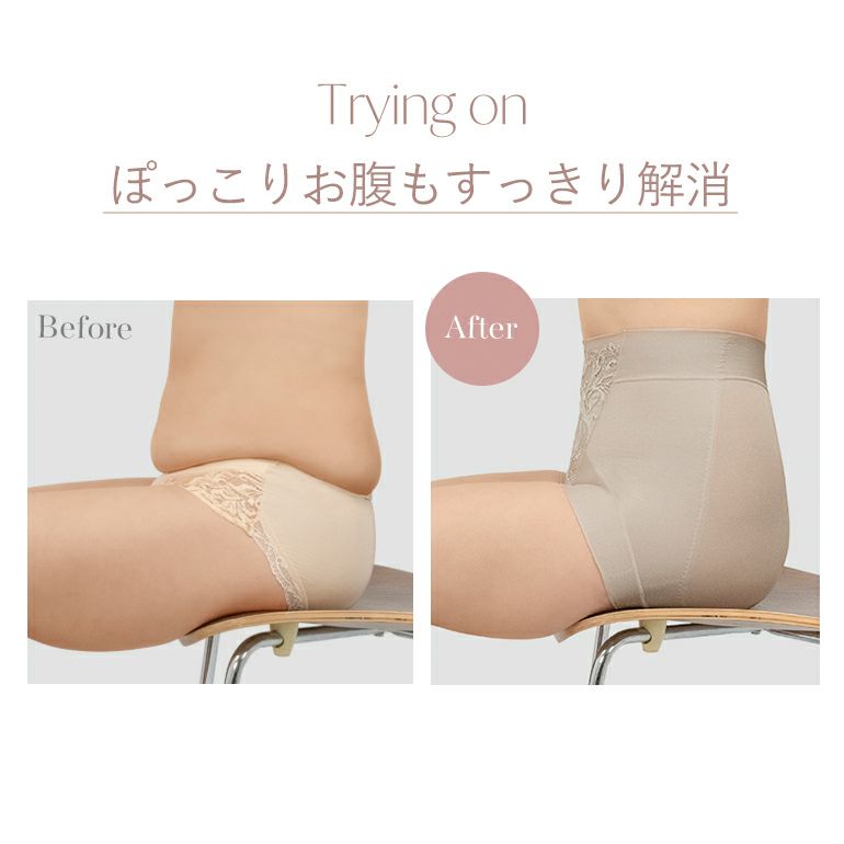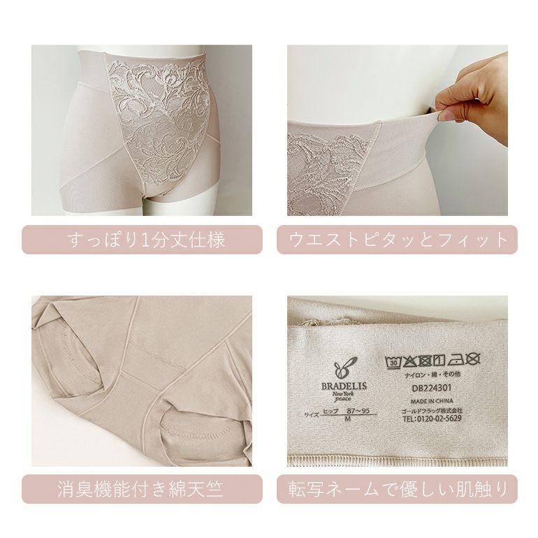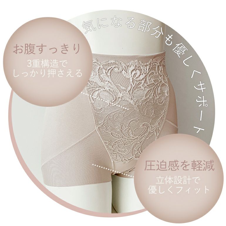 - ソフトパワーネット・身生地・レースの三重構造で、お腹をすっきり整えます。
